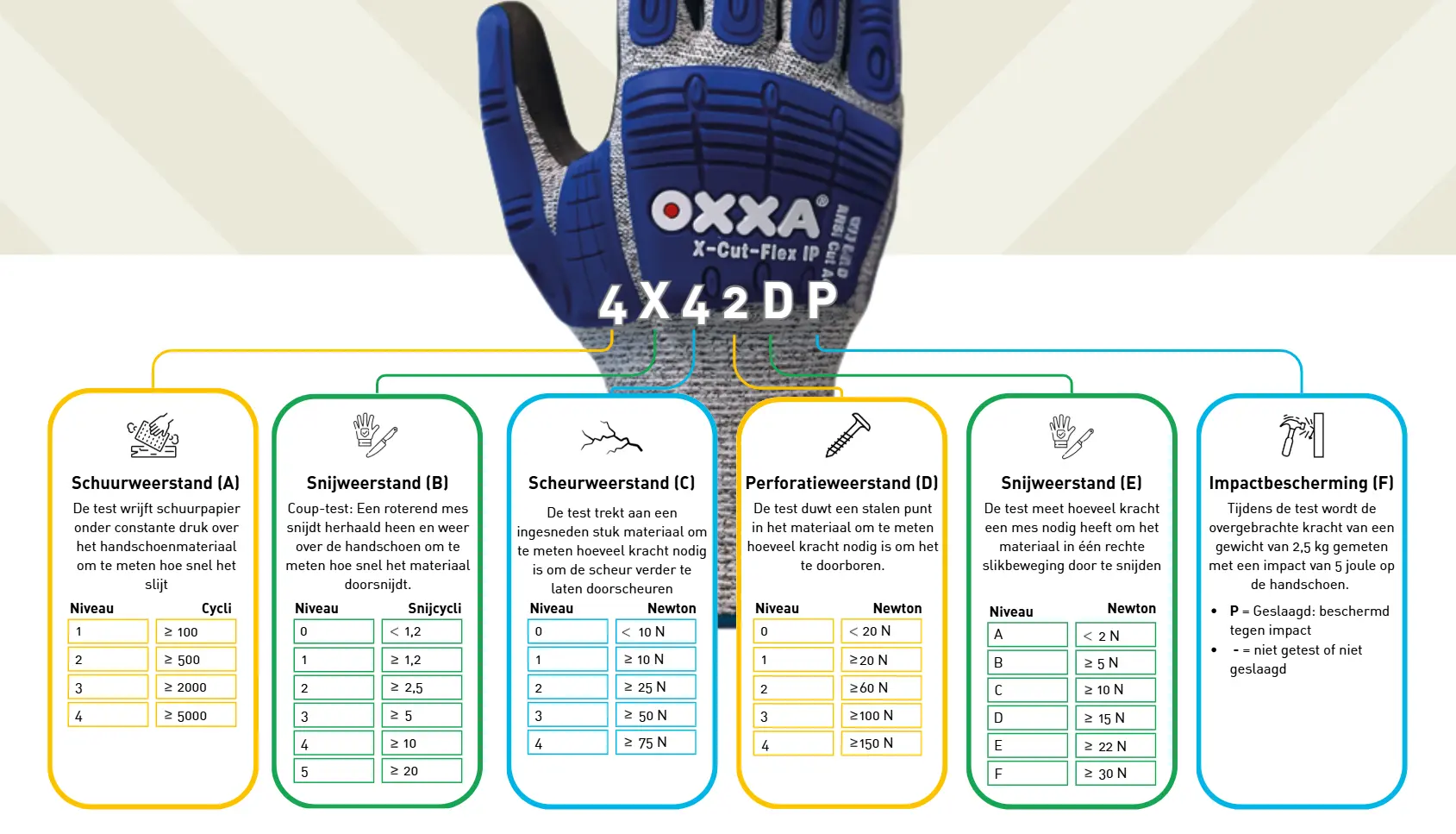 Hoe hoger de letter, hoe beter de handschoen bestand is tegen snijrisico’s.